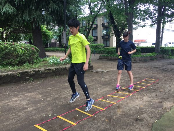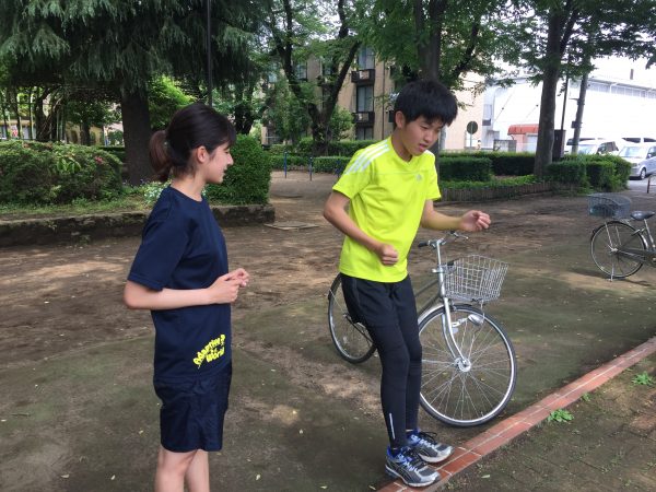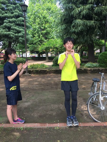 走る際のトレーニングでは、時間をかけてコーチの手の叩くリズムに合わせてジャンプ。