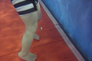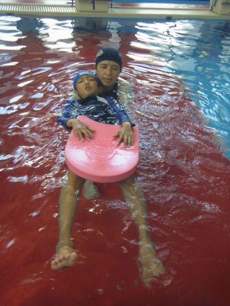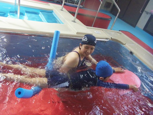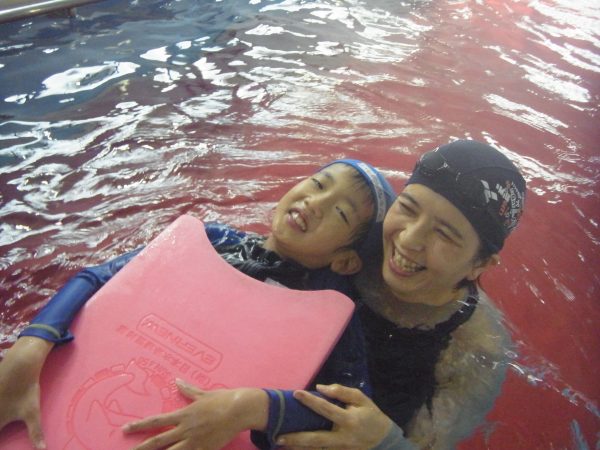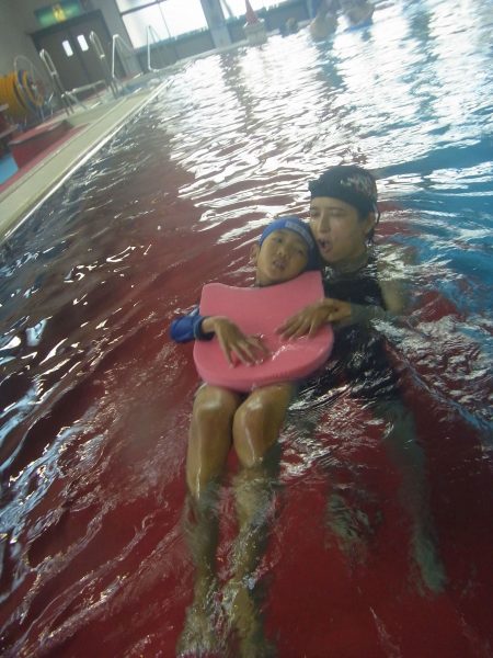 コーチの補助と浮具を関節を伸ばす位置に入れることで、浮く姿勢ができました。^^